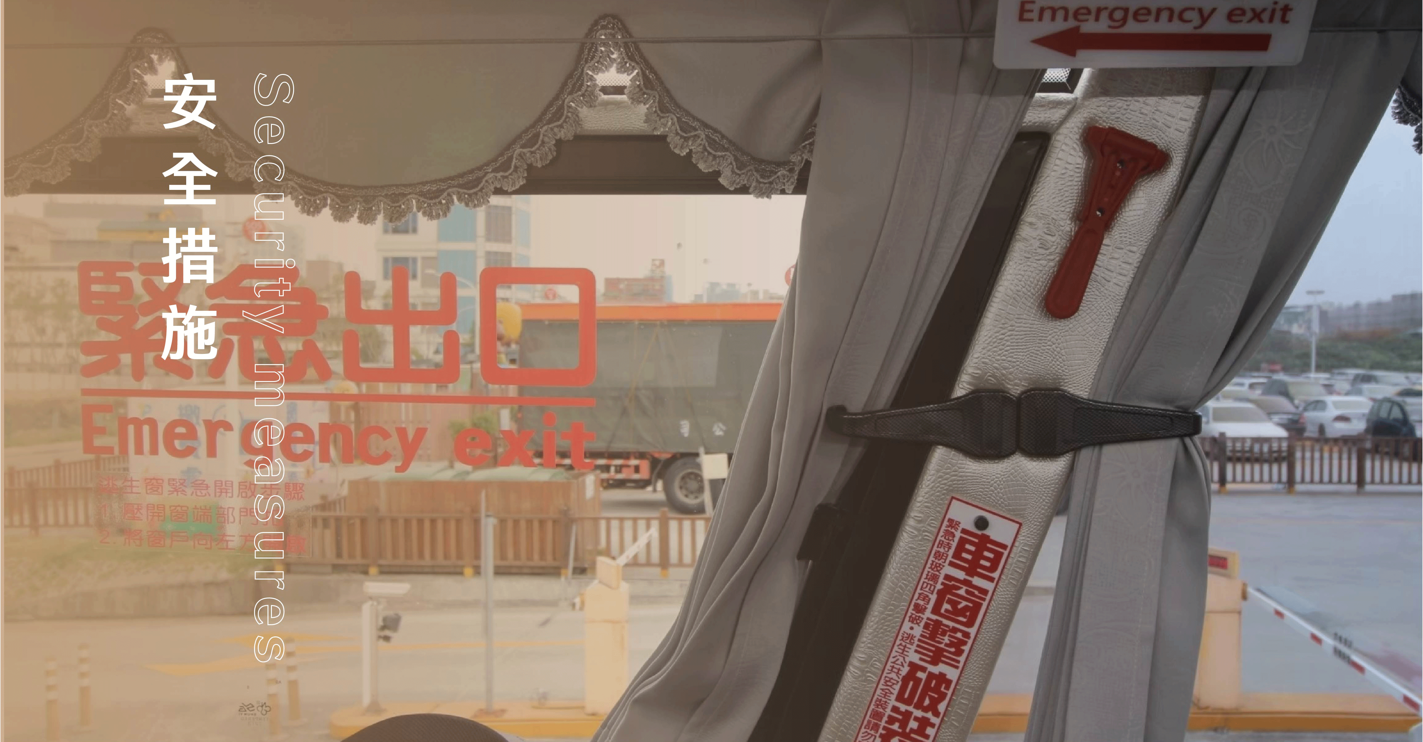 全車設有緊急出口與擊破器,並配置滅火器,符合交通安 全規範,緊急時刻即時應變,確保乘客安全無虞。
